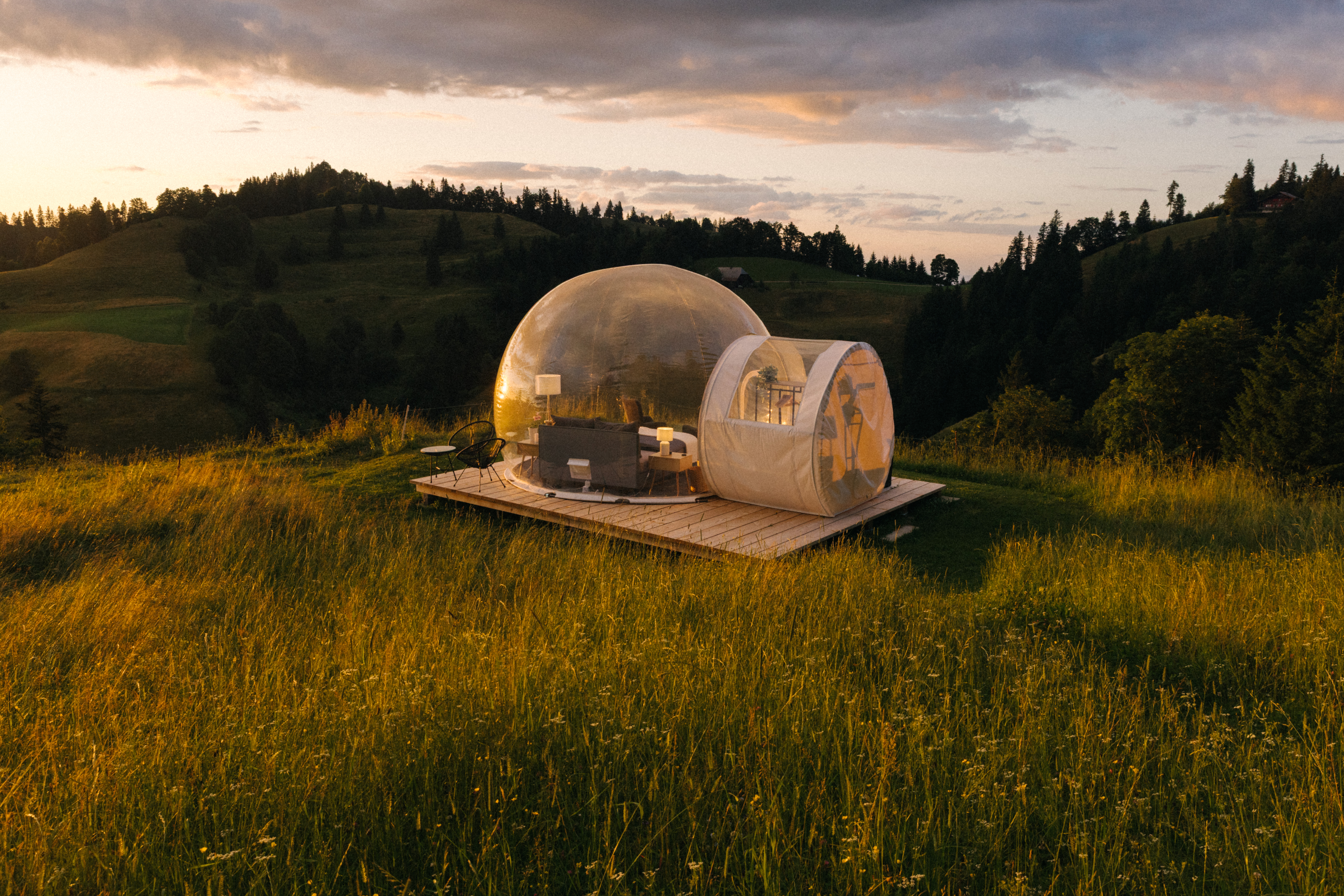 Das Bubble Tent auf der Zuckeralp liegt mitten im Herzen des Emmentals – auf rund 1100 Metern Höhe, umgeben von sanften Hügeln, weiten Weiden und einer beeindruckenden Aussicht bis zur Jurakette. Hier genießt ihr zu zweit eine Auszeit voller Ruhe, Naturverbundenheit und Weitblick, fernab vom Alltag.